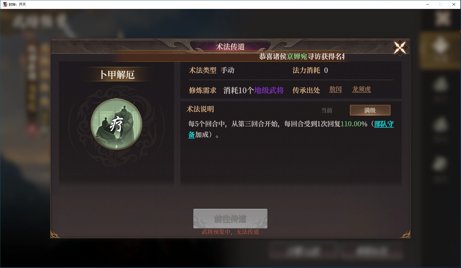 卜甲解厄(包含熬閏、龍須虎):持續5回合,每3回合可恢復330%的血量,此技能特性適合用于紂王隊伍。