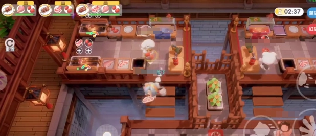 這本質上就是二人轉,不能一直停留在上面。緊接著就得備好烤架,趁燒烤還沒熟透,趕緊先去切菜,秉持上菜優先的原則。由于切好菜后上菜速度較快,所以得為下一輪菜品留出充足空間。這兒的過道較為狹窄,要是不加快速度,大家都會直接堵在這兒。剛開始玩時,玩家可以和朋友約定誰走外側、誰走內側,等玩熟悉了就無需再作規定。