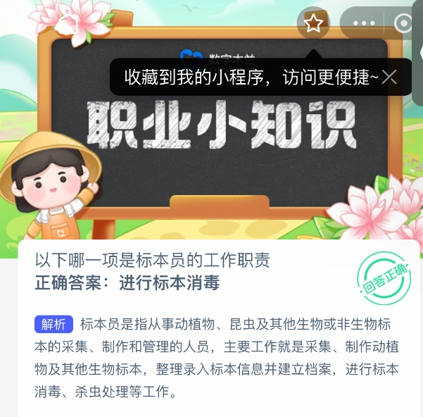 以下哪一項屬于標本員的工作職責呢?這是2025年5月22日支付寶螞蟻新村的題目。每天參與螞蟻新村答題,既能學到有意思的職業小知識,又能提升木蘭幣的產出速度,助力小鎮建設。今日的正確答案為【進行標本消毒】。標本員的主要工作涵蓋采集、制作動植物以及其他生物標本,整理并錄入標本信息,建立相關檔案,同時還需開展標本消毒、殺蟲處理等工作。