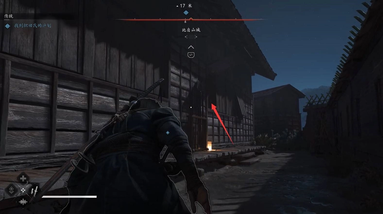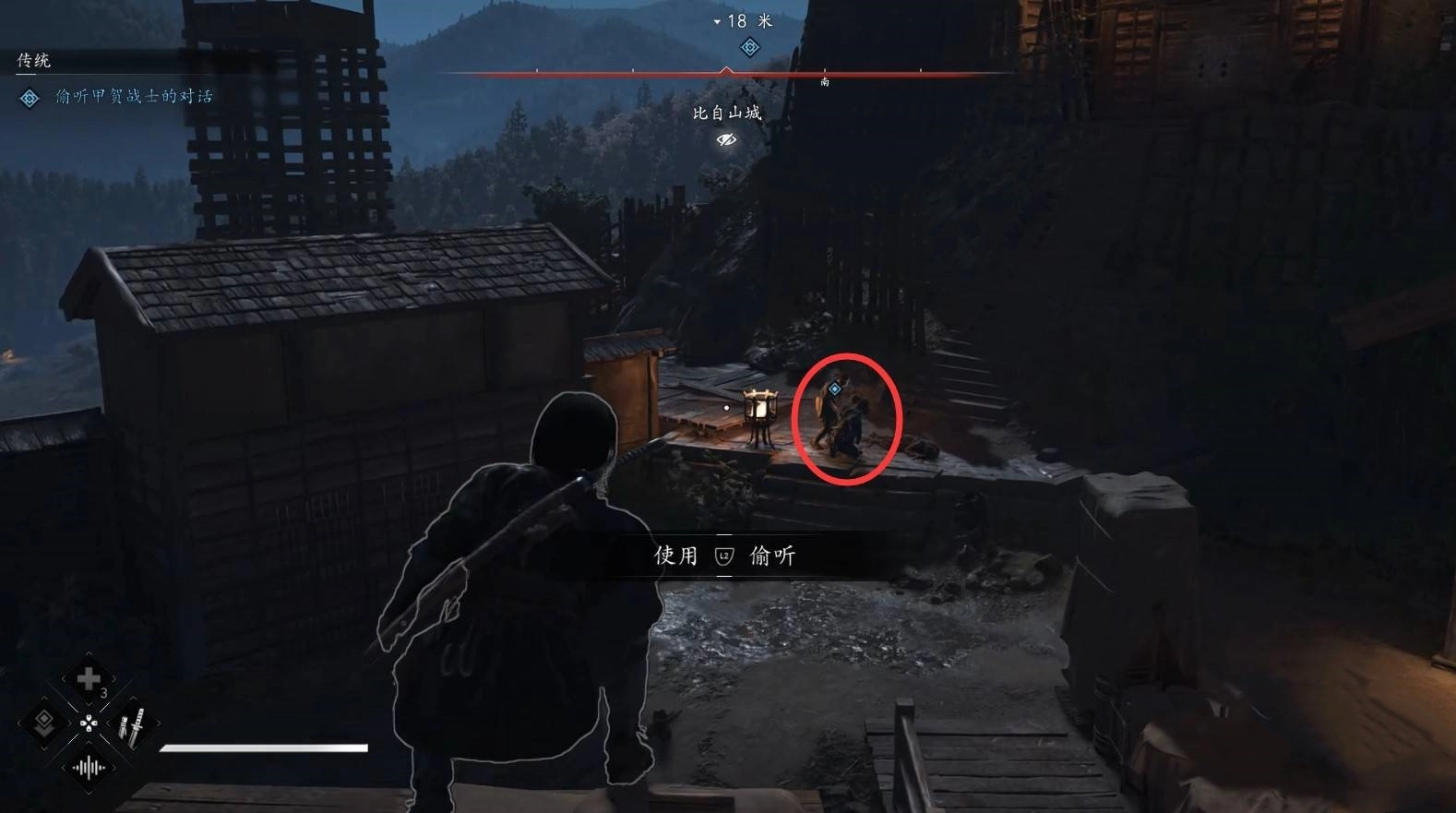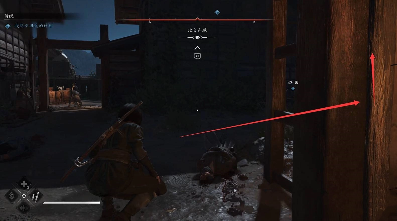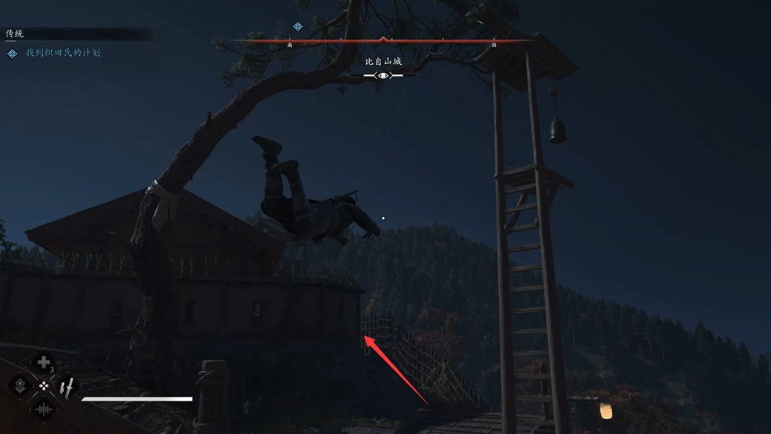 接著,我們借助鉤繩躍至右側,隨后從右側潛入營地。