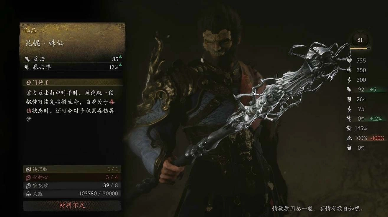 2、仙品——昆棍·蛛仙:在第四回戰勝BOSS紫蛛兒后,該武器的鑄造功能將同步開啟。