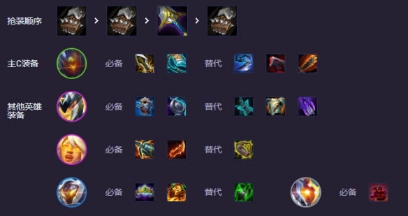 2、其余英雄裝備:瑟莊妮必須配備圣盾使的誓約、薄暮法袍。澤麗必須配備海妖之怒、鬼索的狂暴之刃。莫德凱撒必須配備冕衛(wèi)、日炎斗篷。賈克斯必須配備竊賊手套。