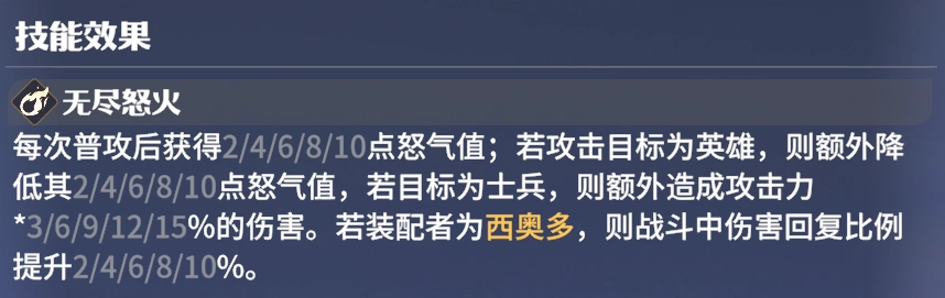 1、無盡怒火(專屬技能):每次進行普通攻擊后,可獲取2/4/6/8/10點怒氣值。倘若攻擊的目標是英雄,那么除了獲取怒氣值外,還會額外使該英雄降低2/4/6/8/10點怒氣值;要是攻擊目標為士兵,除正常傷害外,還會額外造成相當于攻擊力*3/6/9/12/15%的傷害。當裝配者是西奧多的時候,在戰斗過程中,傷害回復比例會提升2/4/6/8/10% 。