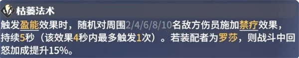 1. 枯萎法術(專屬技能):當觸發盈能效果時,會隨機對周圍2、4、6、8或10名敵方受傷單位施加禁療效果,此效果持續5秒(并且該效果在4秒內最多觸發1次)。要是裝配者是羅莎,那么在戰斗過程中,回怒加成會提升15% 。