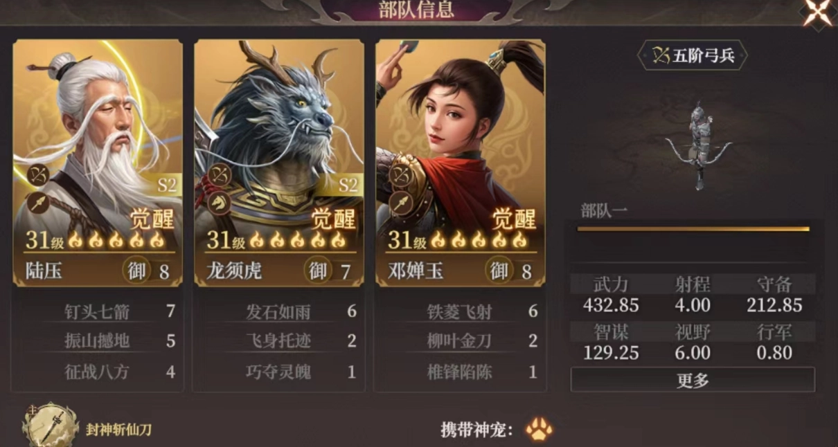 1、弓兵陣容:陸壓搭配龍須虎,或者趙公明搭配鄧嬋玉。此套弓兵組合爆發力超強,陸壓、龍須虎以及鄧嬋玉這三位都具備群體傷害能力。鄧嬋玉能施加減速效果,讓對手極為難受;龍須虎可以給敵人掛上易傷buff;而陸壓更是厲害,能無視防御并施加禁療效果。該陣容生存能力強,不懼騎兵沖擊,不管是開荒階段還是攻城之時,都極為好用。一旦各種增益buff疊滿,傷害堪稱恐怖。