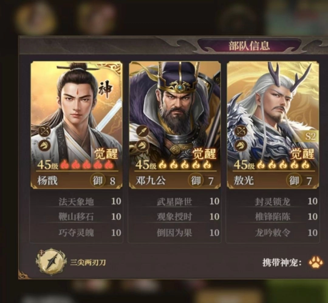 1. 騎兵的頂級陣容當屬楊戩、敖光、鄧九公的組合。這三位強力角色一旦發起沖鋒,簡直勢不可擋。敖光攜帶能增加追擊傷害的配置,楊戩的武力值會隨著戰斗進行不斷提升,鄧九公則憑借連擊效果追著敵人猛砍。在技能方面,推薦選擇鞭山移石與觀象授時,不僅輸出爆表,還具備控場能力。搭配龍吟敕令與椎鋒陷陳,再以移精變氣保障續航。這套陣容操作起來極為簡單直接,一上場就朝著敵方沖去,面對脆皮陣容可以瞬間將其秒殺。不過要留意,千萬別被槍兵陣容克制,要是碰到控制流陣容,則需靈活調整走位。