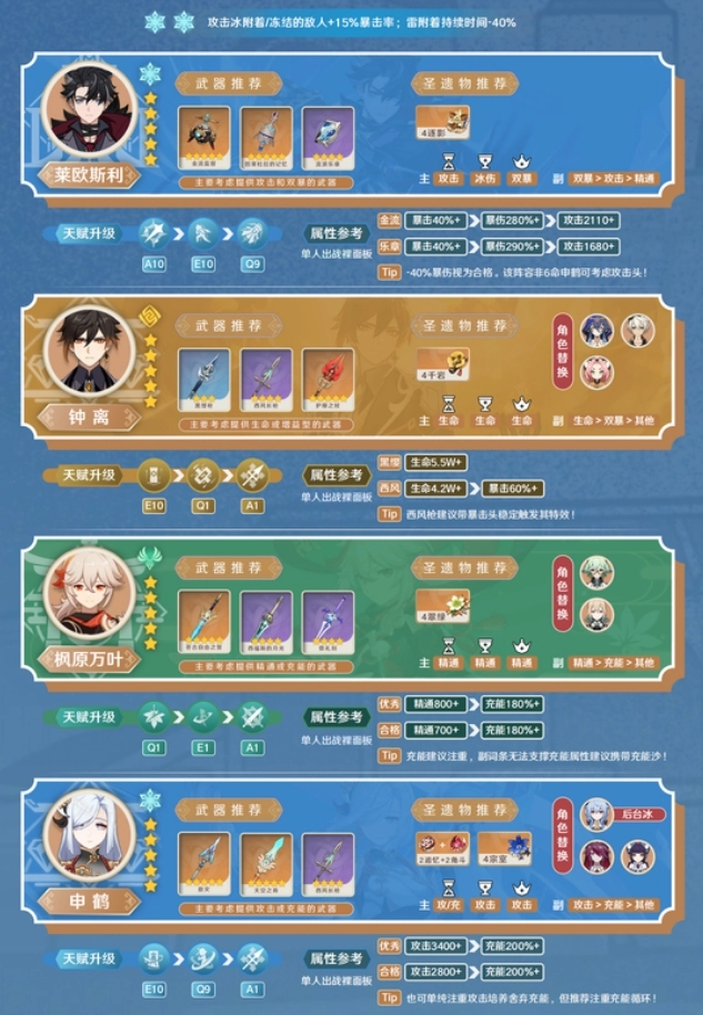 萊歐斯利搭配4逐影,基本無需擔憂暴擊率。若再配上冰系專屬輔助申鶴,能實現極高的傷害收益。要是沒有申鶴,可考慮甘雨、羅莎莉亞、凱亞等擁有后臺持續傷害機制的角色。