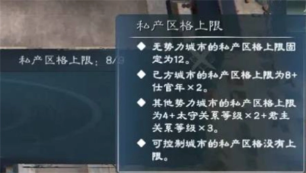 私產建設上限說明:每個城市中,無主的空白城市,其可建設的上限數量為12個。所以,當您手頭擁有一定資金的時候,要盡快前往無主城市,打造屬于自己的商業帝國。為了能夠更高效地利用時間,在此建議您提前前往蓬萊山購買傳送符。