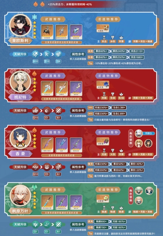 原神中萊歐斯利的陣容構建方向,常見的有融化流、永凍流,還有純冰隊。此篇主要分享的是融化隊的玩法,該融化隊陣容搭配為香菱、班尼特,再加上萬葉。