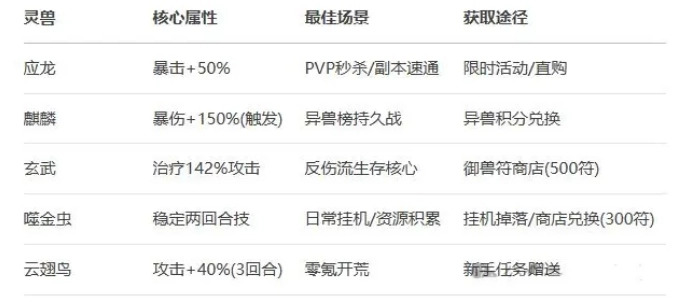 1、玄武:作為反傷流的靈魂靈獸,它每隔2回合便會釋放技能。該技能的治療量能夠達到主角攻擊力的142% ,與此同時,還會提升治療效果(此效果最多可疊加5層)。憑借這種高額的續航能力,為反傷機制提供了生存保障。