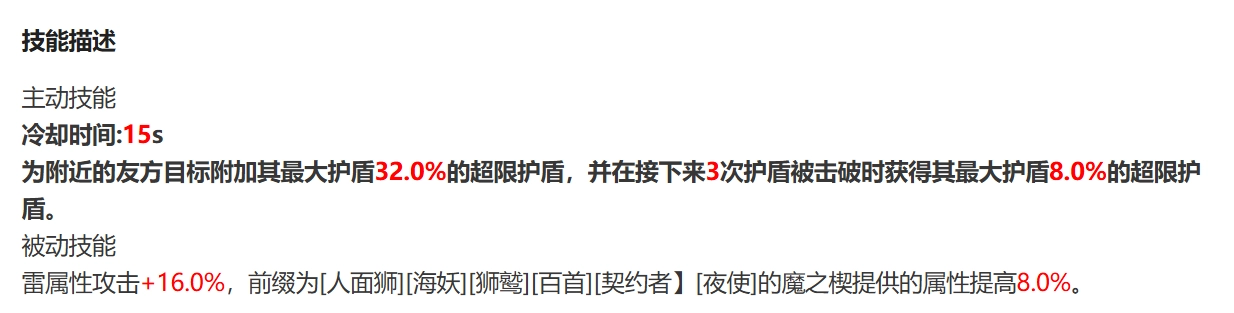 被動技能可增加炸毛球自身雷屬性攻擊傷害。該被動技能觸發(fā)后,魔靈自身的雷屬性共濟會提升16.0% 。若前綴帶有諸如人面獅、白首、海妖、獅鷲、夜使以及契約者等魔之契所提供的屬性,這些屬性將會提升8.0%。