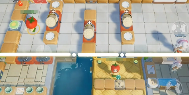當關卡地圖徑直被劃分成兩個截然不同的區域時,鮮嫩的牛排與煎鍋之間便會出現一個間隔。在這種情況下,玩家能夠選擇使用投擲技能。玩家僅需按住屏幕,依據食材的重量,進而調整拋物線的角度,在松開手的剎那,食物就會徑直落進鍋中。這一操作相對較為簡單,比如可以將左側切好的番茄直接投放到右側的湯里,盡管中間有近三米寬的料理臺,但只要蓄力瞄準,自然而然就能直接達成完美連擊的效果。