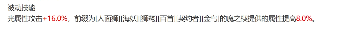 被動技能可讓角色的光屬性攻擊提升16%。若鑲嵌人面獅、契約者、金烏、還要、獅鷲以及白首等魔之楔,屬性還能再增加8% 。