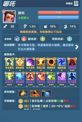 緊接著,借助“精華回收”這張卡牌,在釋放大招后實(shí)現(xiàn)藍(lán)量補(bǔ)充。在戰(zhàn)斗過程中,5級天賦、哪吒自身被動技能“奧法之焰”以及10級天賦帶來的回復(fù)效果觸發(fā)的“療愈之焰”,這些元素會在每次哪吒釋放大招時,為其疊加極高的怒火層數(shù)。隨著怒火層數(shù)不斷攀升,哪吒依靠被動技能打出的傷害也會越來越多。除了上述常規(guī)玩法思路,哪吒在游戲中還有另一種連敗流玩法。