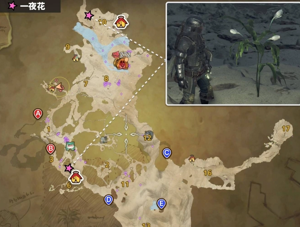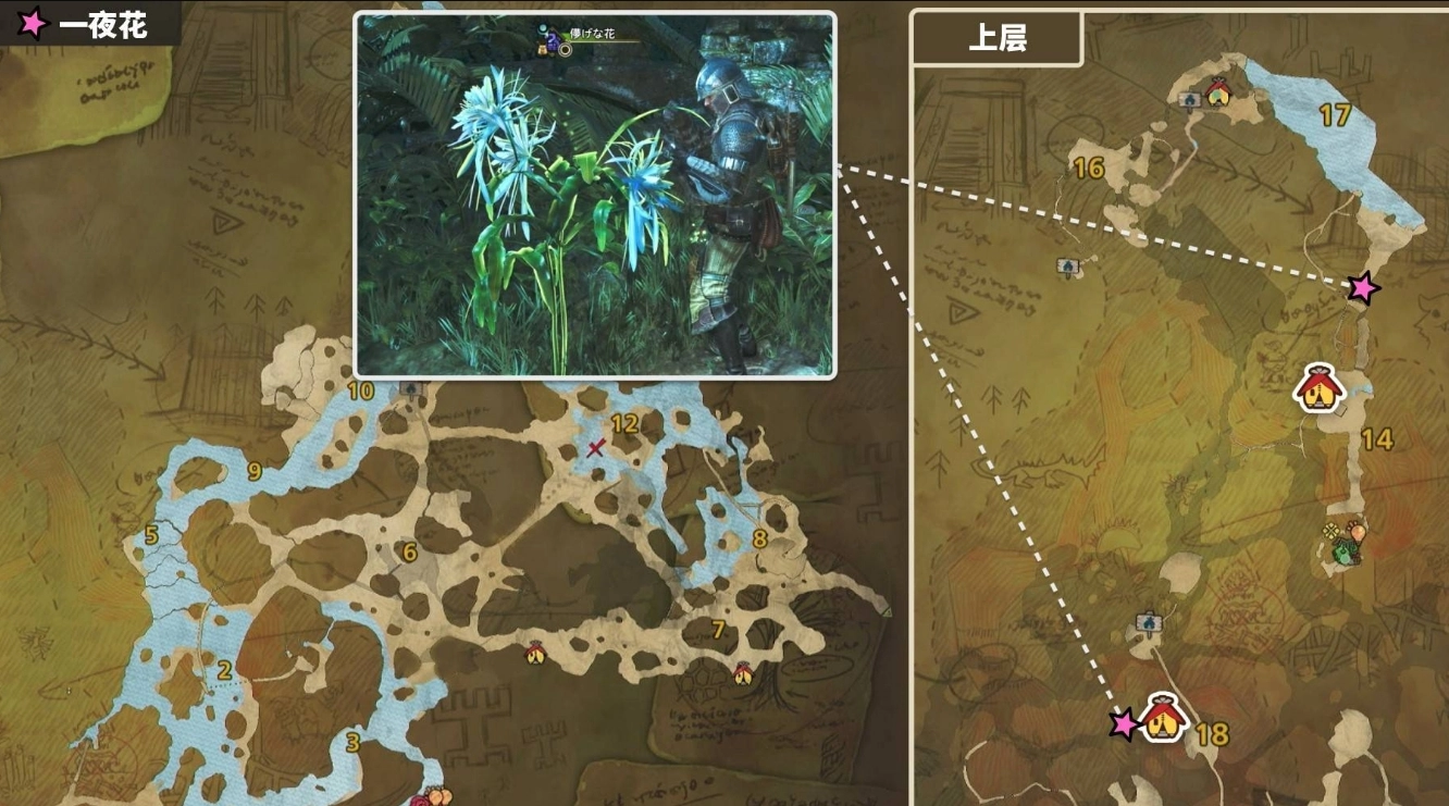 一夜花會于滿月之夜現身在天塹沙原與緋紅森林這兩張地圖里,每張地圖設有2個刷新點。一夜花不會在環境概要中顯示,不過能借助左下角的圖示篩選,以此確定其是否在地圖上出現。