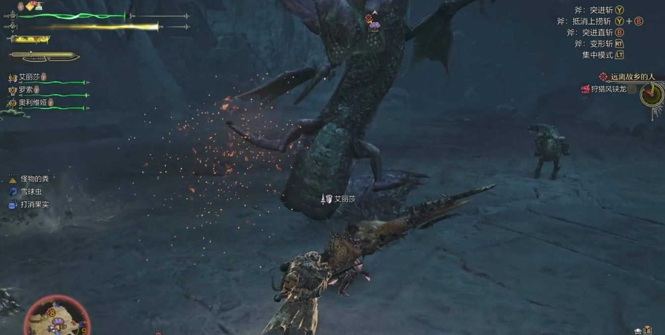 一旦看到這個動作的前搖,就要馬上開始躲避,迅速離開剛剛站立的地方。風鋏龍施展完這一招后,它的頭部會暫時插入地面,處于無法動彈的狀態。此時要抓住這個后搖時機,進行一波全力輸出。