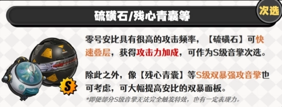 零號安比的攻擊頻率相當高,借助[硫磺石]能夠迅速疊層,進而獲取攻擊力加成,因此可將其視為S級音擎的次選方案。