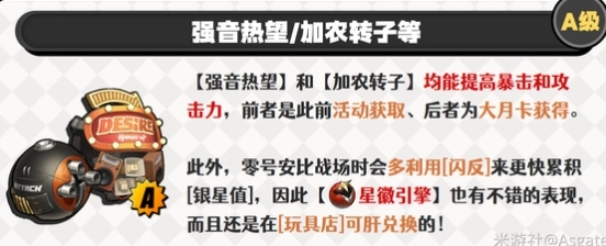 [強音熱望]與[加農轉子]都可以提升暴擊和攻擊力,其中[強音熱望]是通過之前的活動獲取,而[加農轉子]則是通過購買大月卡獲得。