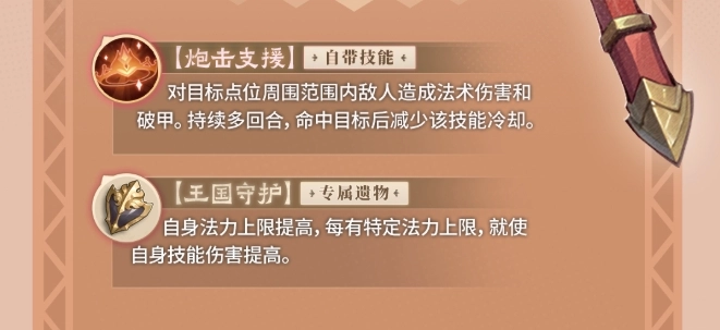 1. 自帶技能【炮擊支援】:對目標點位周邊一定范圍內的敵人造成法術傷害,并使其破甲。此效果持續多個回合,技能命中目標后,會縮短該技能的冷卻時間。