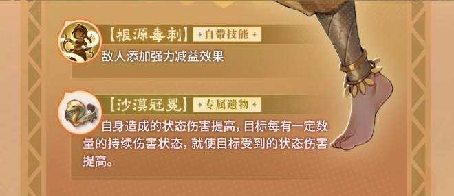 2、專屬遺物【沙漠冠冕】:自身所造成的狀態傷害提升,若目標身上每具備一定數量的持續傷害狀態,便會使目標所受的狀態傷害得到提高。