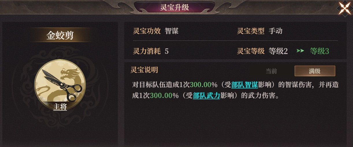 3、自帶靈寶金蛟剪達(dá)到滿級(jí)時(shí),能造成300%的智謀傷害與300%的武力傷害。不過(guò),其實(shí)際效果會(huì)依據(jù)陣容有所不同。在智武雙修的陣容里,傷害倍率能達(dá)到最高,單點(diǎn)爆發(fā)能力與魔禮青相比毫不遜色。而在其他隊(duì)伍中,實(shí)際傷害則會(huì)有所降低。