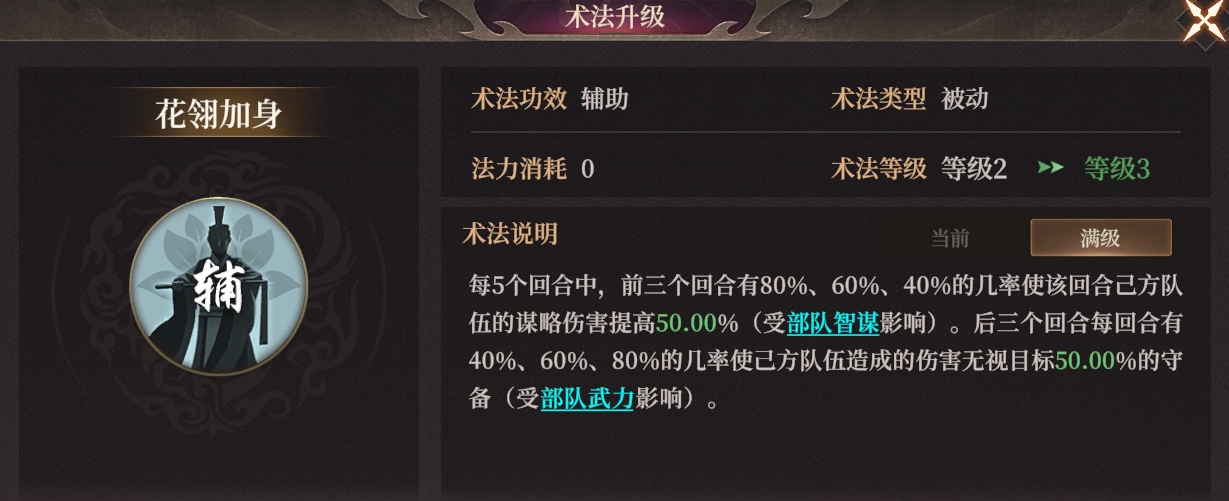 2、自帶術(shù)法以5回合為一個(gè)循環(huán)周期,在前三個(gè)回合會(huì)提高謀略傷害,后三個(gè)回合則能無(wú)視敵方守備。滿級(jí)時(shí)數(shù)值達(dá)到50%,這一數(shù)值給得較高,能顯著提升全隊(duì)傷害。不過(guò),依據(jù)戰(zhàn)報(bào)顯示,增益效果存在失效的情況(不然疊到233%就過(guò)于超標(biāo)了)。