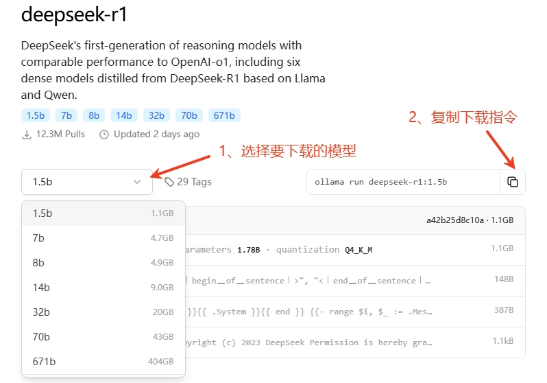 訪問下方鏈接,選擇要下載的模型,并在右側復制對應的命令,這里以最小的1.5b版本作為演示。