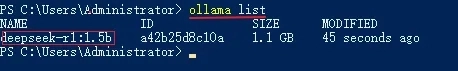 然后在命令行里輸入“ollama list”來查看下載成功的模型,下圖這種情況就代表一切準備就緒了。