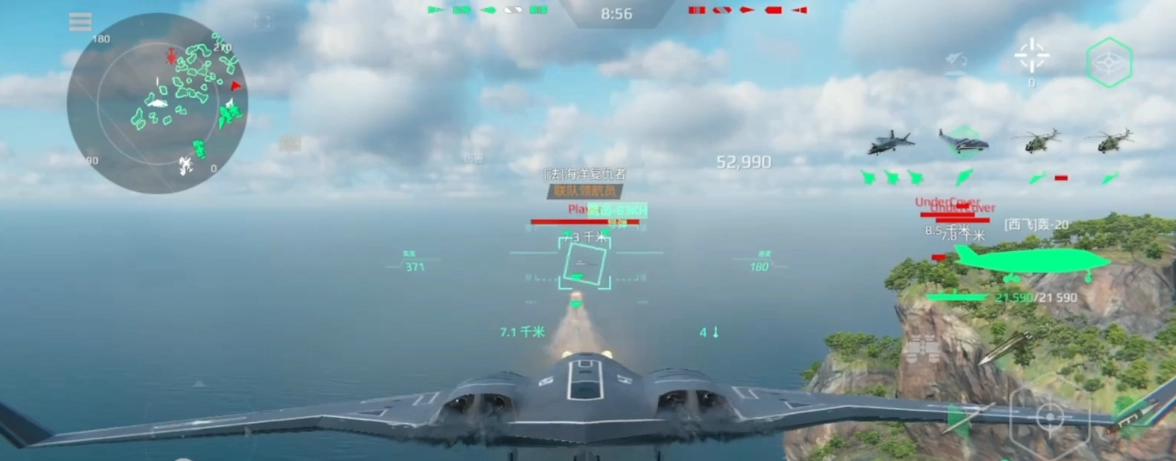 僅剩最后一架B52,其遠程速度相當出色,導彈射擊速度平穩,還具備突防功能,備彈充足。操作時,機動性與血量表現突出,戰斗過程較為平穩,單輪傷害極高。然而,整體速度偏慢,使用過程中極易被敵方直升機針對。