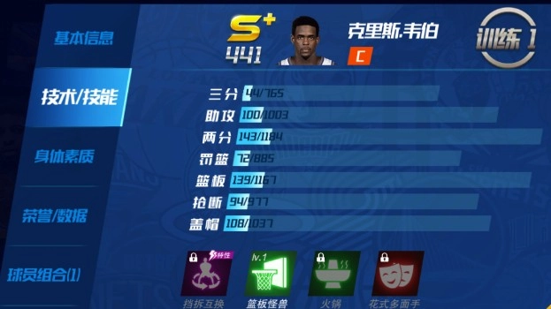 【三技能】花式多面手:具備豐富多樣的進攻方式,每當成功投進一球,自身三分能力提升X%,自身兩分能力提升Y% ,此效果最多可觸發3次。(消耗物品:中鋒手冊、蓋帽訓練卡、啞鈴、克里斯·韋伯訓練計劃,陪練教練需為大師級別的自己)