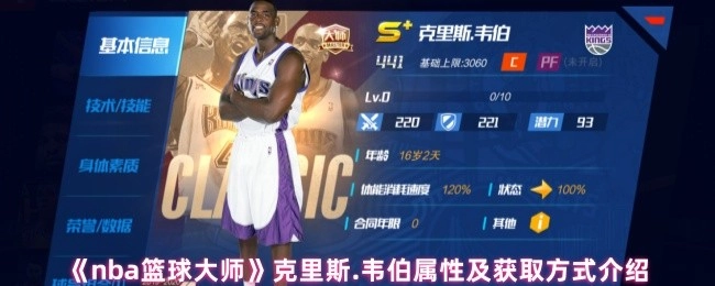 在《NBA籃球大師》游戲里,眾多球員基礎屬性各異,不少玩家想知道克里斯·韋伯該怎么獲得。接下來,小編就為大家介紹克里斯·韋伯的屬性以及獲取方式。克里斯·韋伯堪稱花式多面手,擁有多樣的進攻手段,每次進球后,自身三分屬性會增加X%,兩分屬性會增加Y% 。下面就一起來看看這位球員的詳細屬性吧。