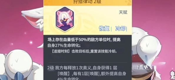 若談及芬里爾的技能,其天賦為狩獵律動。倘若場上存在血量低于50%的敵方單位,芬里爾自身的生命轉化會提高27%。奧一完成擊殺后能重置冷卻。當芬里爾這個角色達到六星級,便可解鎖2級天賦,每次釋放奧義都能疊加一層喚醒buff,每層可額外獲得4%的吸血值。當我方釋放一次奧義,芬里爾自身可獲得一層奧義,每一層喚醒還會額外提升自身4%的生命轉化。