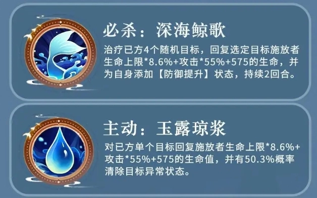 小喬定位為純治療型奶媽,具備全游戲世界中最強的群體治療效果。其必殺技“深海鯨歌”,施展后會隨機為己方四個目標帶來恢復(fù)。回復(fù)量具體數(shù)值為施放者生命上限的8.6%,再加上攻擊力的55%,還額外有575固定生命值的加持。更奇妙的是,治療后小喬自身會獲得一層防御提升狀態(tài)的增益,該狀態(tài)將持續(xù)兩個回合。