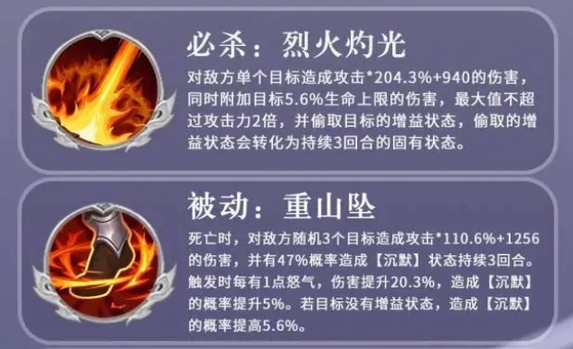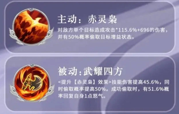 觸發時,每存在1點怒氣,傷害便提升20.3%,造成沉默的概率也會提升5%。要是目標不存在增益狀態,造成沉默的概率再額外提高5.6%。主動技能“赤靈梟”,能夠對敵方單個目標造成“攻擊×115.6% + 696”的傷害,且有50%的概率偷取目標增益狀態。而被動技能“武耀四方”,會增強“赤靈梟”的效果,使技能傷害提高45.6%,偷取概率同時提高50%。在成功偷取增益狀態時,還有51.6%的概率回復自身1點怒氣。
