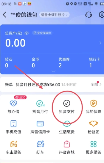 3、進入錢包,找到【抖音支付】(點擊進入!)