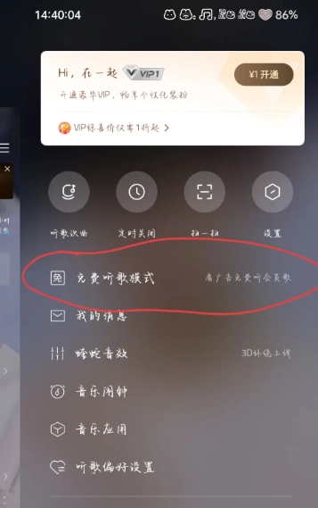 2.打開側(cè)欄后,點擊免費聽歌模式,進入圖三
