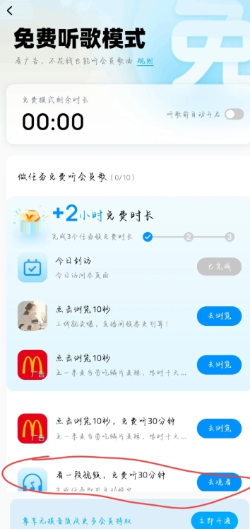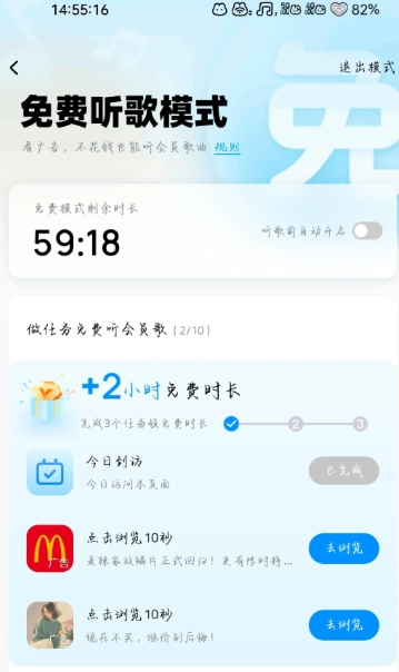 3. 于圖三中選擇完成任務(wù),就能獲取免費聽歌時長。