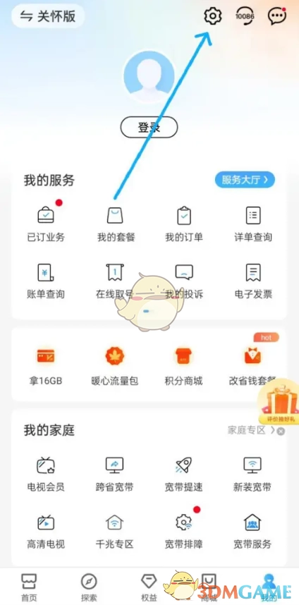 1. 開啟中國移動app,于“我的”頁面點擊“設(shè)置”