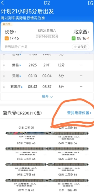 1在12306平臺上,自己所乘坐的車次下方,會有充電口位置的標示。