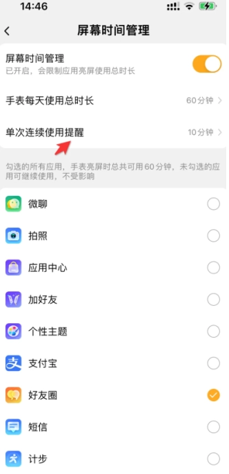 在手機小天才app中,依次點擊“更多”-“健康管理手表”-“屏幕時間管理”,在“手表每天使用總時長”處進行選擇,同時也留意下單次連續使用提醒。