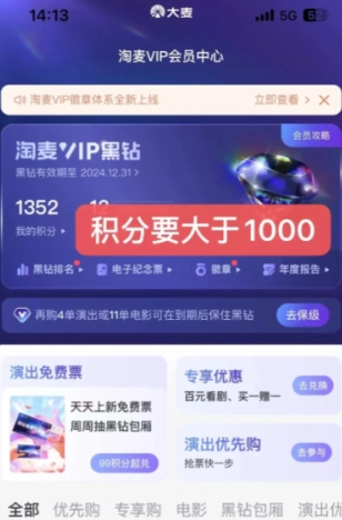 第二部:來(lái)到會(huì)員界面,能看到淘麥 VIP 。要是剛注冊(cè)的新賬號(hào),或者從未搶過(guò)票,就還沒有會(huì)員,也就無(wú)法參與抽獎(jiǎng)。必須是 vip 黑鉆,且積分大于 1000 ,否則不能抽取優(yōu)享購(gòu)。