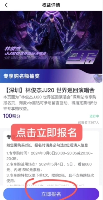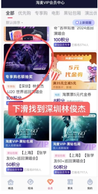 在部分演唱會(huì)場(chǎng)次中,大麥網(wǎng)設(shè)有專享購(gòu)買通道。需提前報(bào)名參與抽獎(jiǎng),只有抽中者才具備購(gòu)買資格(強(qiáng)調(diào)僅為資格)。而且,參與者必須是大麥黑鉆會(huì)員,可在演唱會(huì)購(gòu)票界面或通過(guò)會(huì)員途徑報(bào)名。通常在搶票前2小時(shí)開獎(jiǎng),中獎(jiǎng)?wù)呒纯蛇M(jìn)入專享購(gòu)賽道搶票。不過(guò)要知道,此賽道并非一定能買到票,只是相比普通渠道,買到票的概率稍高一些。