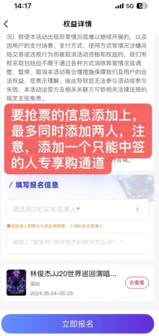 第五步:輸入需要觀演人員的實(shí)名信息。專享購(gòu)添加人數(shù)限制為最少1人,最多2人。若僅添加一人,后續(xù)搶票時(shí),只有登記專享購(gòu)的觀影人能夠使用專享購(gòu)搶票,未登記人員無(wú)法參與搶票。