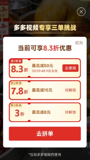 打開拼多多進入首頁,點擊下方的視頻入口,再點開右上角的金幣圖標,通常三單折扣挑戰活動會顯示在最上方。該活動中,第一單可享83折優惠,最高減免50元;第二單能有78折優惠,最高減免15元;第三單則是3折優惠,最高減免8元。