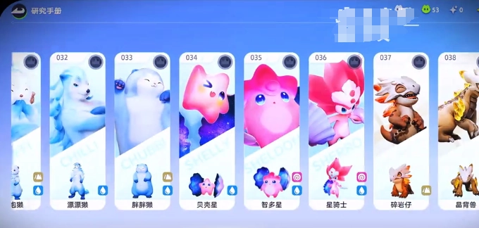 玩家打開研究手冊后,便能看到各類屬性各異的伊莫,有水系、草系、火系等,甚至還有一些較為獨特的屬性類別。