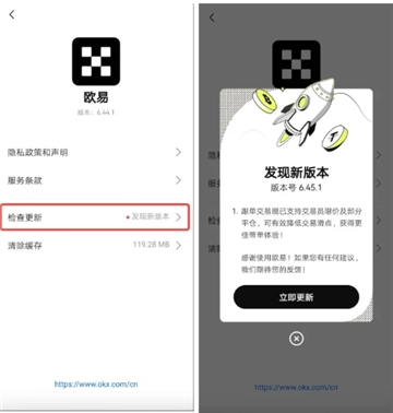 1歐易App新版本一經上線,便會在首頁以彈窗形式通知。您只需滑動彈窗中的【立即更新】,即可下載安裝最新版本。