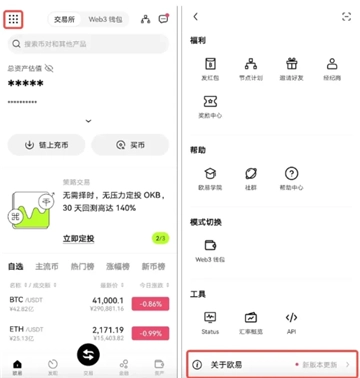 2、您也能夠點擊App首頁左上角的全功能圖標,選擇【關于歐易】,接著點擊【檢查更新】-【立即更新】,下載并安裝最新版本。