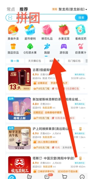 1. 點開餓了么應用程序,在搜索框中查找【拼團】。