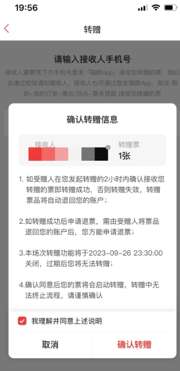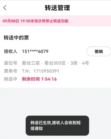 使用在貓眼登錄所用的手機號(此手機號與大麥注冊手機號一致)登錄大麥賬號,添加相同的觀影人。在大麥票夾中,能夠查詢到相關信息。大麥平臺允許轉讓一次,但需注意,在演出前48小時將停止轉讓服務。