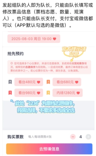 1. 組隊規則:創建隊伍者擔任隊長,隊長能夠通過分享的方式,邀請好友加入隊伍一同參與搶票,無論是在 APP 還是微信小程序上都可操作。需要注意的是,票品信息僅能由隊長填寫,具體填寫位置可參考 P1 和 P2。
